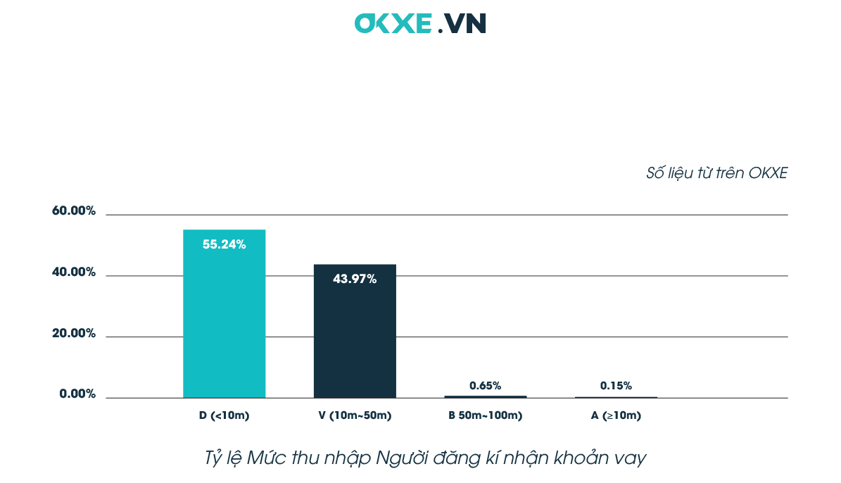 Trong gần 2.000 người gửi yêu cầu vay này, mức thu nhập chủ yếu của người mua tập trung vào hai cấp độ chính là cấp D (thu nhập dưới 10.000.000 đồng) và cấp C (thu nhập từ 10.000.000 đến 50.000.000 đồng). Những khách hàng có mức thu nhập cao hơn cũng có nhu cầu vay. Tuy nhiên vay để mua xe máy không đáng kể. Đặc biệt, qua khảo sát, những khách hàng có nhu cầu mua xe trả góp. Thường chỉ muốn vay trong thời gian ngắn từ 12 – 24 tháng.