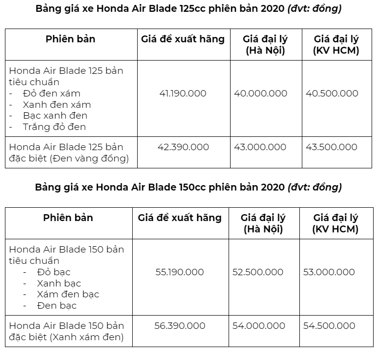 Trên đây là bảng giá xe Honda Air Blade 2020 được cập nhật mới nhất, giá đã bao gồm thuế VAT nhưng chưa bao gồm phí thuế trước bạ – phí bảo hiểm và phí ra biển số. Bạn đọc có thể tham khảo cách tính Giá xe Air Blade lăn bánh qua bài viết chia sẻ giá xe Sirius ở phần trước nhé.