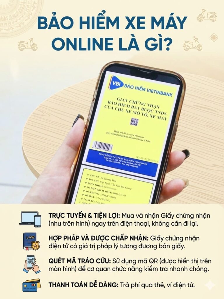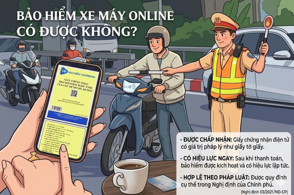 - Bảo hiểm xe máy online có được không? — Được, hoàn toàn hợp lệ theo pháp luật Việt Nam.