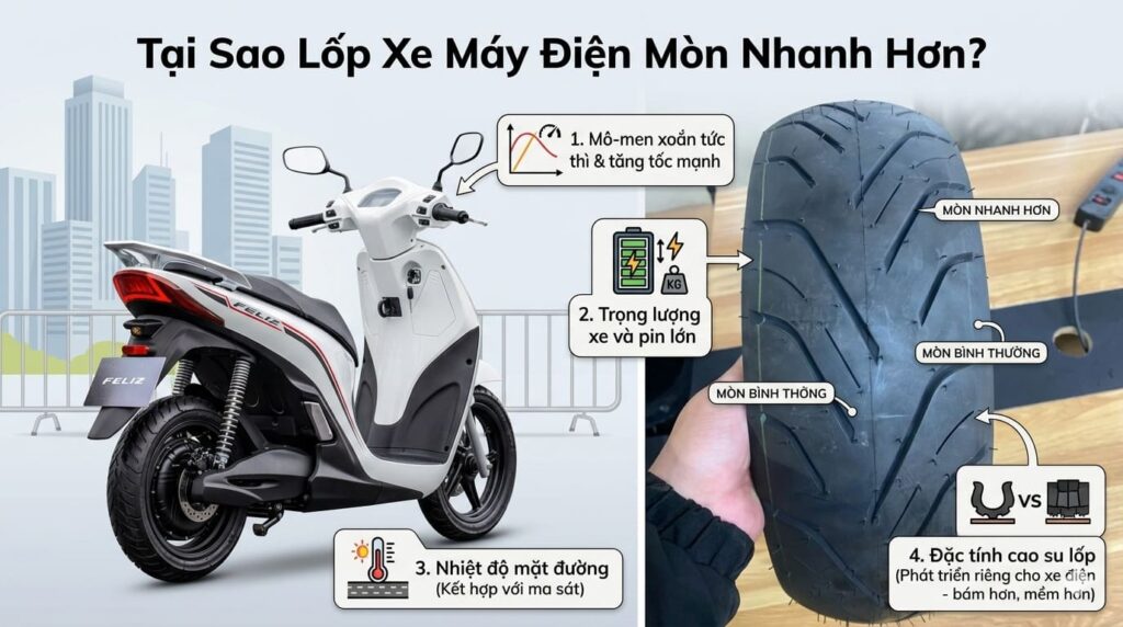 • Lốp xe máy điện mòn nhanh hơn xe xăng là sự thật có cơ sở kỹ thuật, không phải tin đồn