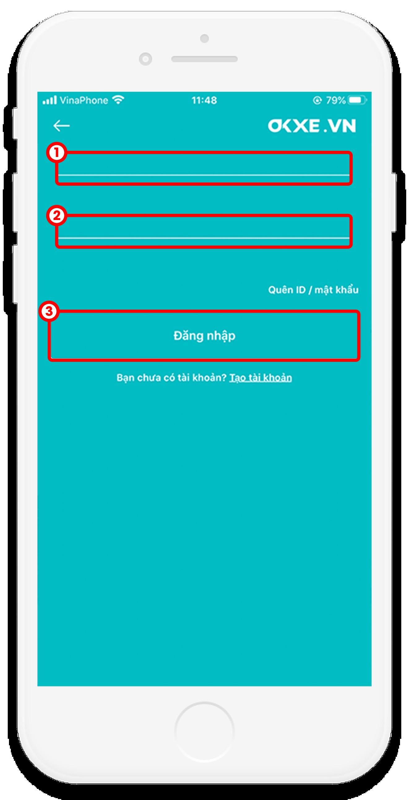 Bước 2: Nhập thông tin gồm tên ID và Mật khẩu bạn đã đăng ký trên OKXE. Sau đó chọn “Đăng nhập”