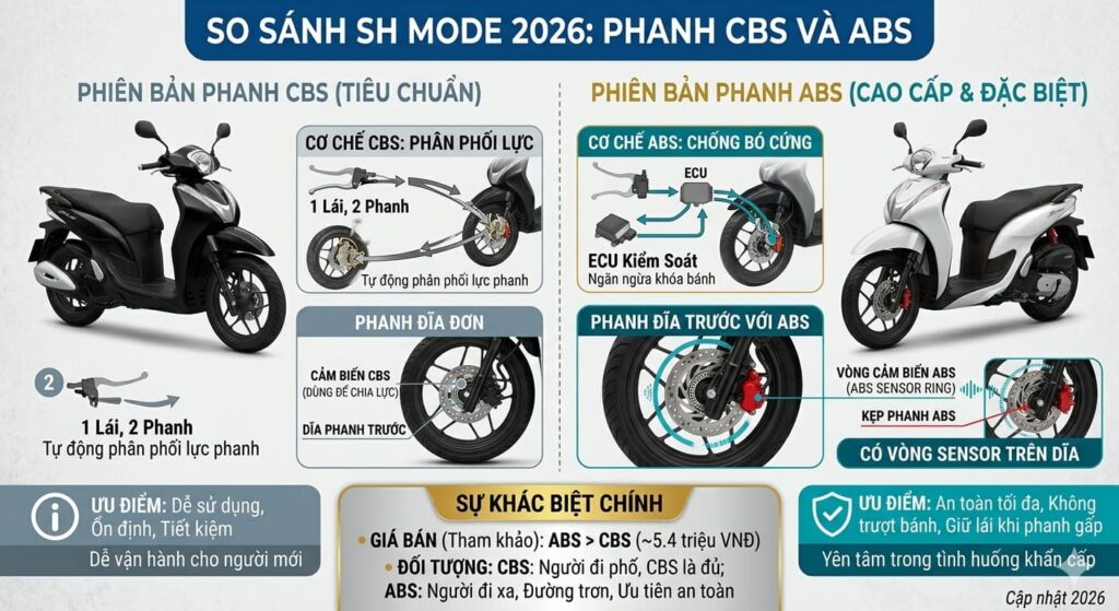 Nhiều người mua xe đặt câu hỏi: SH Mode có phanh ABS không? Câu trả lời phụ thuộc vào từng phiên bản cụ thể. Honda SH Mode hiện có hai lựa chọn về hệ thống phanh — ABS và CBS — tương ứng với mức giá và phân khúc người dùng khác nhau. Hiểu rõ sự khác biệt này giúp bạn chọn xe an toàn và phù hợp ngân sách nhất.