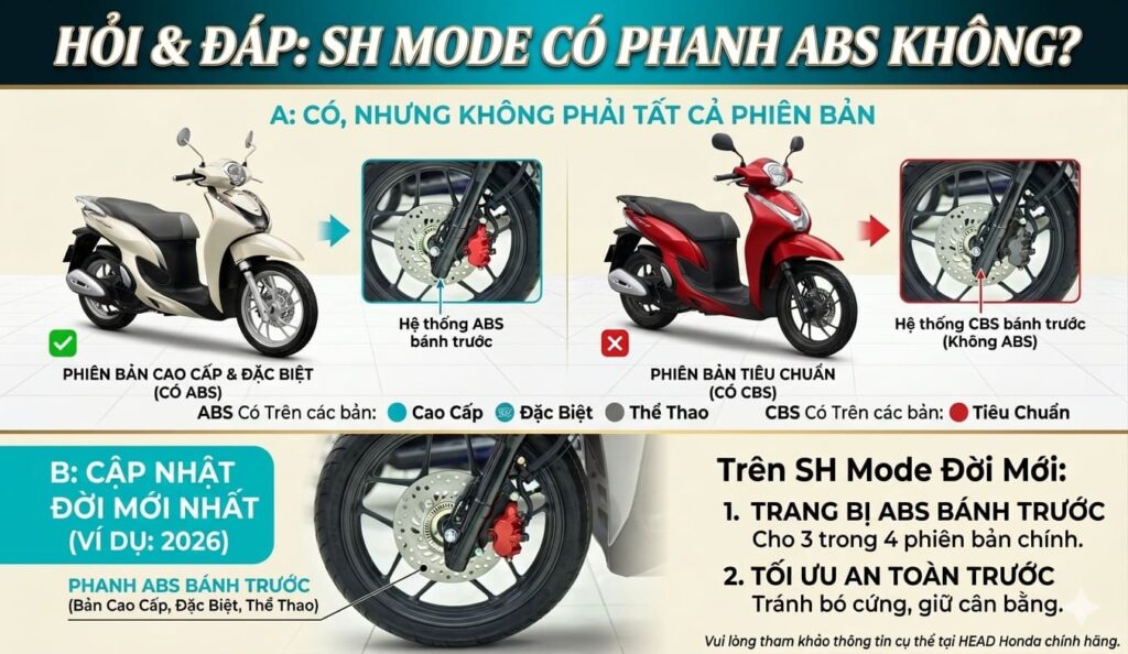SH Mode là một trong những xe tay ga phổ biến nhất của Honda tại Việt Nam — nhưng không phải phiên bản nào cũng được trang bị phanh ABS. Bài viết này giải đáp rõ ràng, giúp bạn chọn đúng xe trước khi xuống tiền.