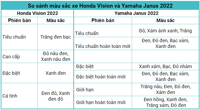 Dưới đây sẽ là bảng so sánh về màu sắc của Honda Vision và Yamaha Janus để bạn có đánh giá khách quan nhất về hai dòng xe này.