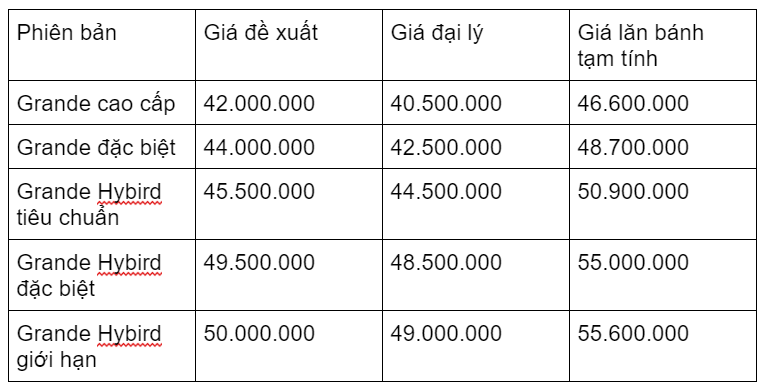 Mức giá ở 2 bảng trên có sự thay đổi ở từng khu vực, đại lý và thời điểm khác nhau. Đồng thời qua 2 bảng trên, ta dễ dàng thấy được xe Grande được định giá cao hơn Acruzo. Trong khi giá đề xuất Acruzo nằm trong khoảng 35.000.000 – 37.000.000 đồng thì Grande lại lên đến 42.000.000 – 50.000.000 đồng.