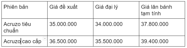 Tiếp theo là bảng giá xe Acruzo mới nhất 2019 với 2 phiên bản tiêu chuẩn và cao cấp. Mức giá đề xuất ở 2 phiên bản không có quá nhiều khác biệt và dao động trong khoảng 35.000.000 – 37.000.000 đồng.