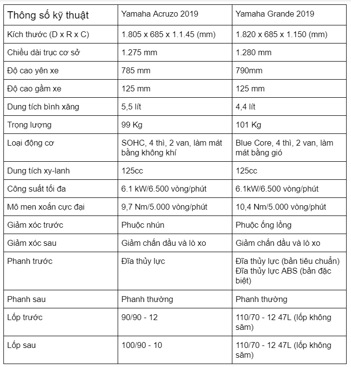 So sánh trang bị của 2 mẫu xe Yamaha Acruzo và Grande