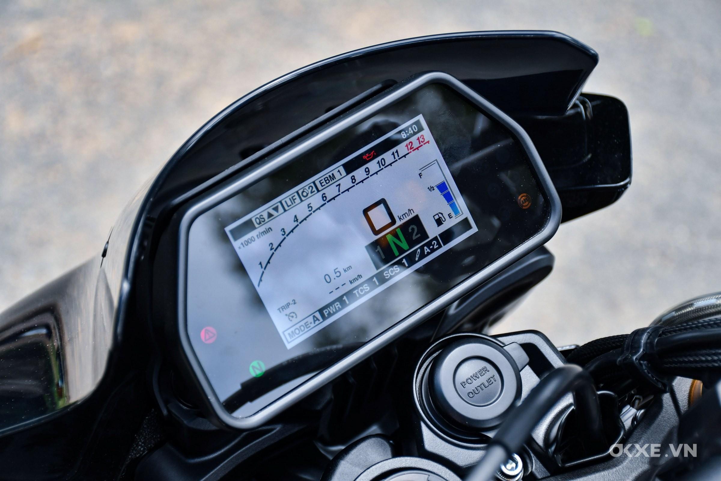 Điểm mới hiếm hoi trên MT-10 2023 là cổng sạc được bố trị ở khu vực đồng hồ, mang đến sự tiện lợi cho người lái. Đây là loại cổng sạc dạng tẩu 12V nên cần có thêm đầu chuyển để tương thích với dây sạc hiện nay.